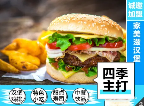 家美滋汉堡店加盟空白区域开店0加盟费开店免费技术培训,家美滋汉堡店面对全国市场开放连锁加盟目前在市场成立已13年全国市场已经有五百多家连锁分店是一家值得信赖的品牌,只